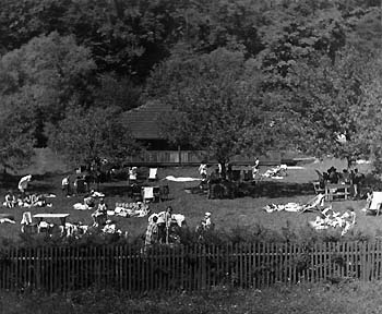 Rekreanti v „Písečných slunečních lázních“ – takto bylo nazýváno toto místo před stavbou koupaliště. V ohybu řeky se zde při povodních naplavoval písek, který byl v létě využíván k „poležení“.